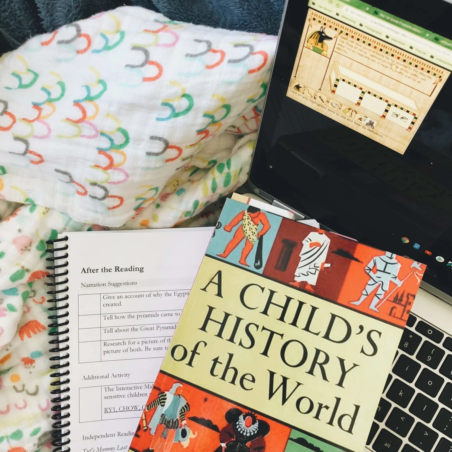 Every day after lunch we have quiet time. Right now, it’s based around our three-year-old’s need for a nap. Once she stops napping we will still have quiet time, though! Sometimes I finally get to eat my lunch at this time, swap out the laundry, catch up on dishes, read, etc. But today, we still had history to do so after I finished some of my chores, we cuddled up on the couch to read together.