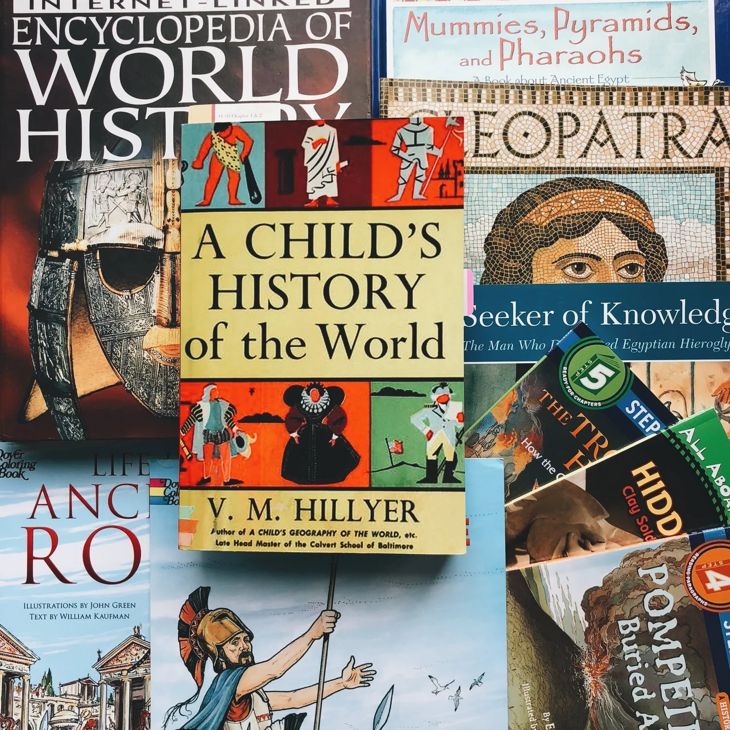 A Mind in the Light begins with Ancient History in Year 1 and uses A Child's History of the World as a spine (the main text). She suggests many books that go along with the readings from the main text, and we get most of them from the library. We love using the Usborne Encyclopedia of World History alongside A Child's History of the World because it's a great visual resource to look at as we read. We do history two days a week, usually reading the chapter from A Child's History of the World on the first day, and the coordinating picture book the following day.