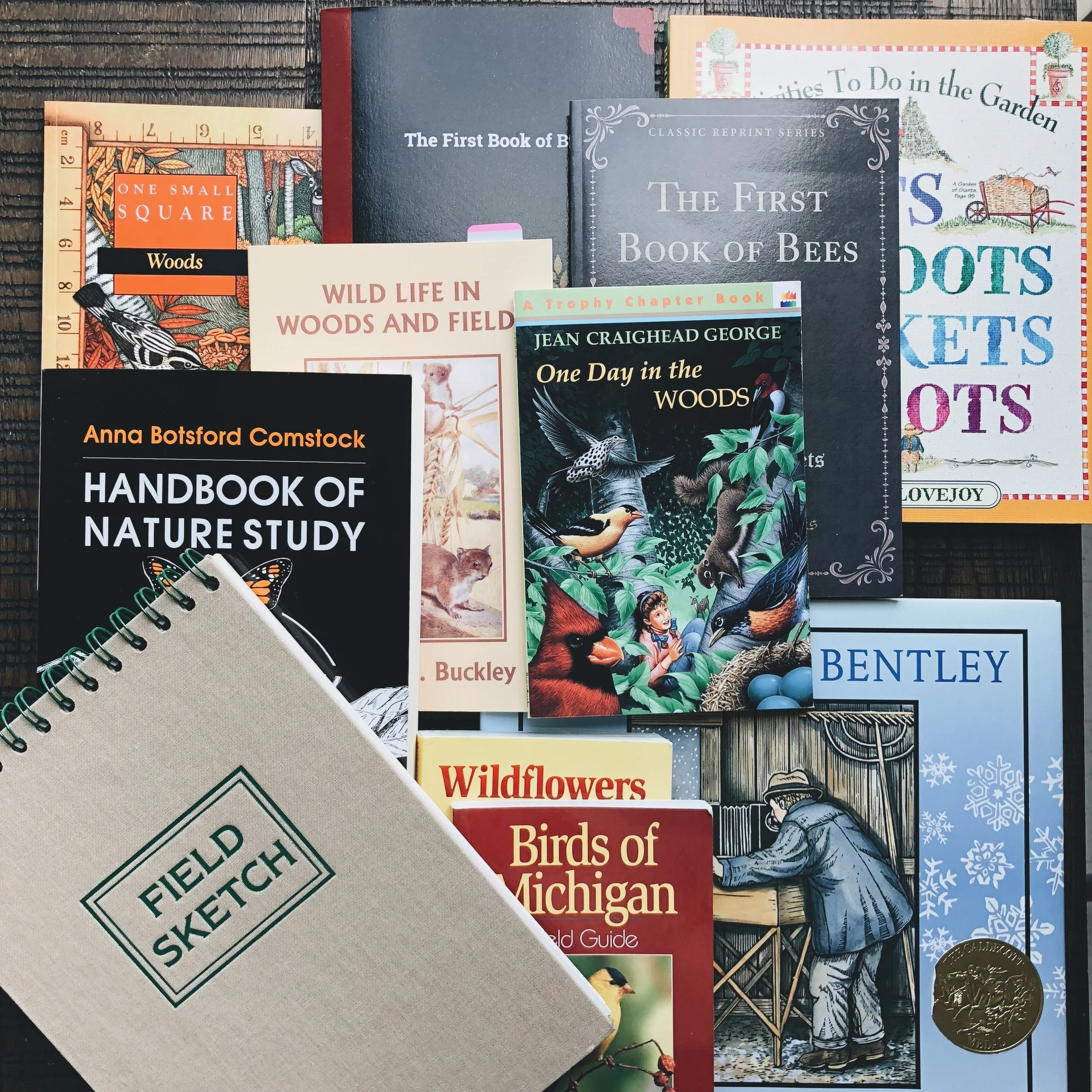 In year one, A Mind in the Light science and nature study focuses on life in the woods, weather, seasons, bugs, bees, and plant life. Outside of the natural history readings, we will do weekly nature study and nature journaling. We do this subject four days a week, but each day looks a little different. The first two days are readings. The third day is Natural History Investigations from the Year 1 Guide - this is like guided experiments or hands-on lessons. Things like bark rubbings, parts of a leaf, measuring rainfall, and growing two plants to see how different things affect the growth. The fourth day is Nature Experience and Nature Journal - so this is the day we spend time in nature with our nature group or alone, then we come home to add something into our nature journals and pull out our field guides.