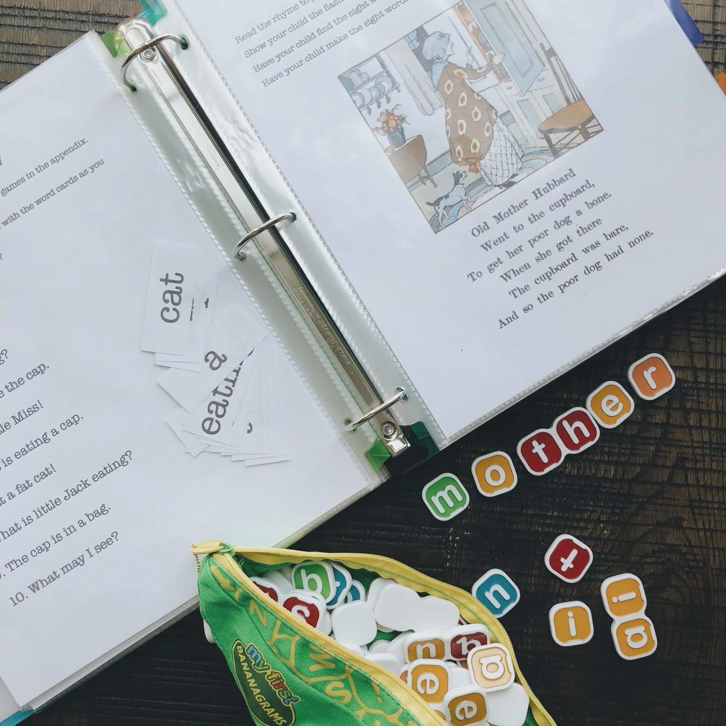 We love using My First Bananagrams to practice word families. Within the Sight & Sound lessons, there are days with word family practice that are to be read off of a page, then made with letter tiles or written in a tray of sand. We pull out the Bananagrams and make "at" then see how many words we can make with it... cat, bat, rat, hat, that.